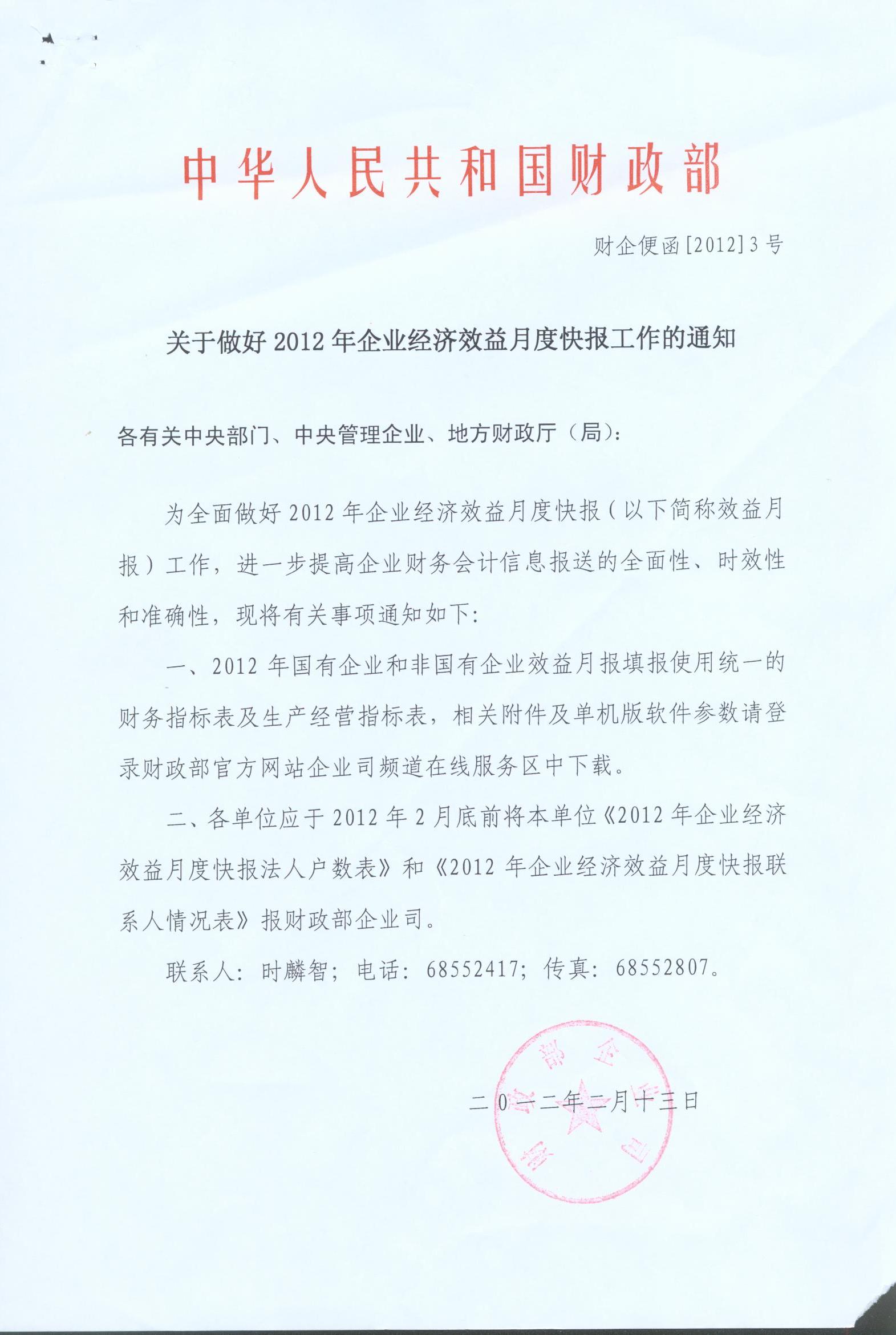 附件:1.《關于做好2012年企業經濟效益月度快報工作的通知》(財企便函〔2012〕3號)